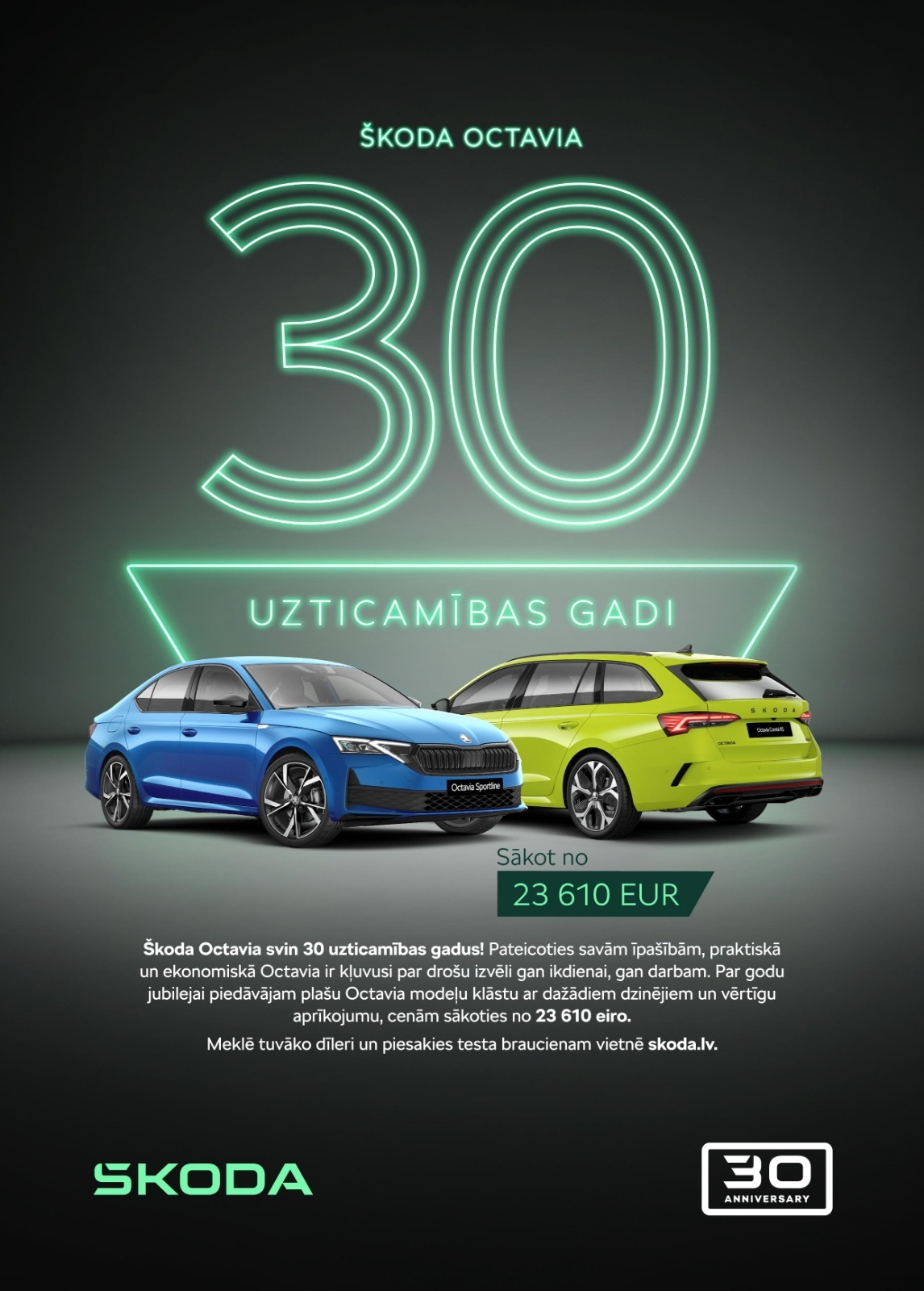 Šogad ŠKODA OCTAVIA svin 30 gadus, un tas ir ideāls brīdis izvēlēties leģendu uz riteņiem!